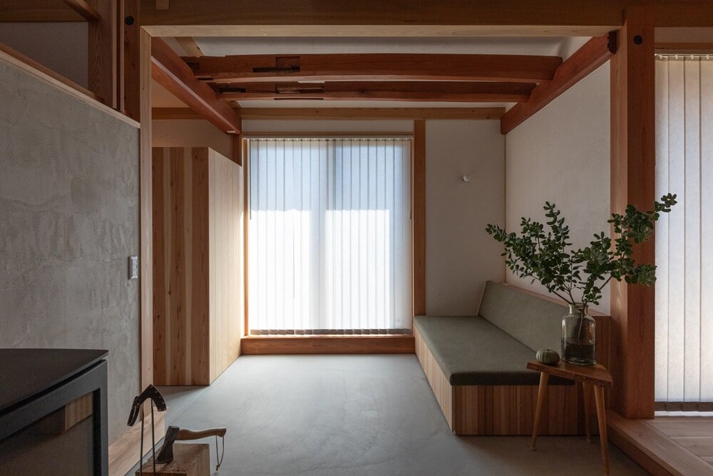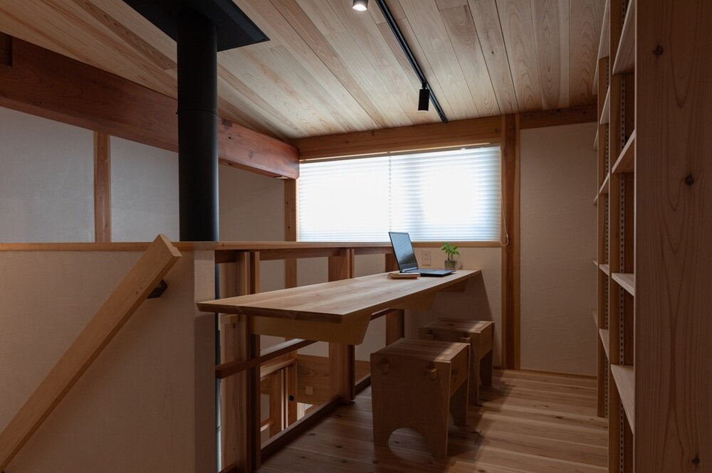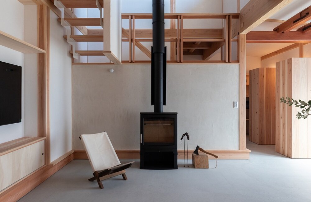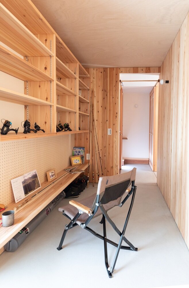 土間リビングの薪ストーブ、趣味の釣部屋など