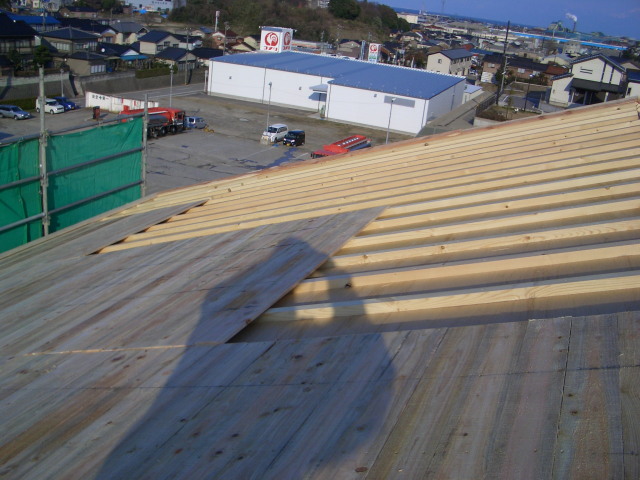 野地板は檜の4分板を使用し屋根裏通気工法です、多少の手間はかかるけどもとても良い工法ですね!いや~勉強になります!!!