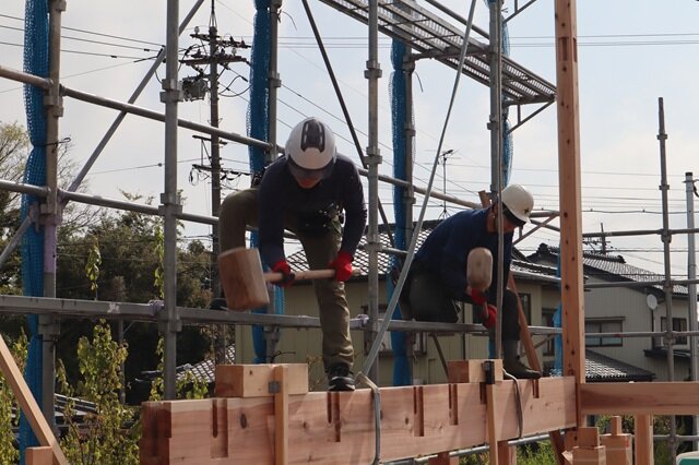 掛矢を叩く音が気持ち良く響く、上棟日和となりました。