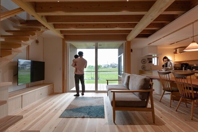 ウッドデッキ、お庭へとつながる開放的なリビング