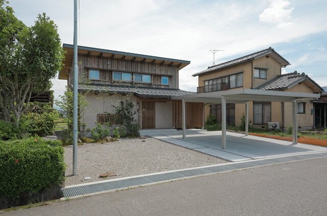 お庭の緑が映える素材と手仕事の味わいを感じる外観。