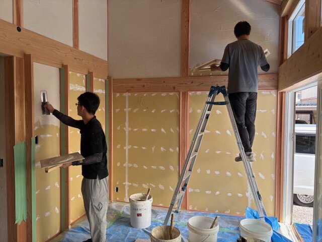 『ばんざいや』では仕上げの塗り壁作業中! 吹抜けのあるリビングは上部まで塗り壁な...